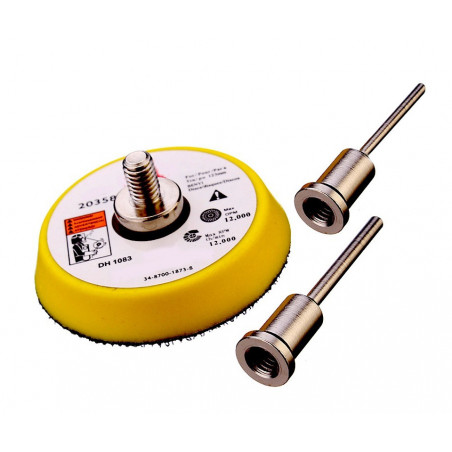 Dette er en 50 mm bred slibeskive/holder til polering og slibning, udstyret med et M6 -skaft, der skal bruges i boremaskiner (også dremel/proxxon og lignende maskiner med 3 mm eller 6 mm montering ved hjælp af den medfølgende adapter). Skiven er forsynet med velcro (krog og sløjfe), så der kan placeres runde plader af slibepapir på den.