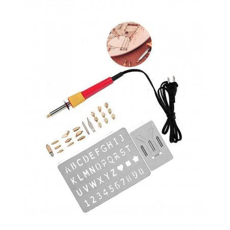 Toto gravírovací pero (hořák na dřevo), které lze také použít jako páječku, lze použít k výrobě čar a kreseb ohněm na korek, kůži, dřevo a podobně. Tato sada kromě pera obsahuje stojan na pero, různé tipy pro značení a gravírování a šablony písmen a číslic. To vše přichází v případě.