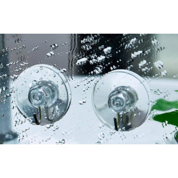 Transparentní, vodotěsné přísavky z PVC s kovovým háčkem, které lze použít k zavěšení předmětů.