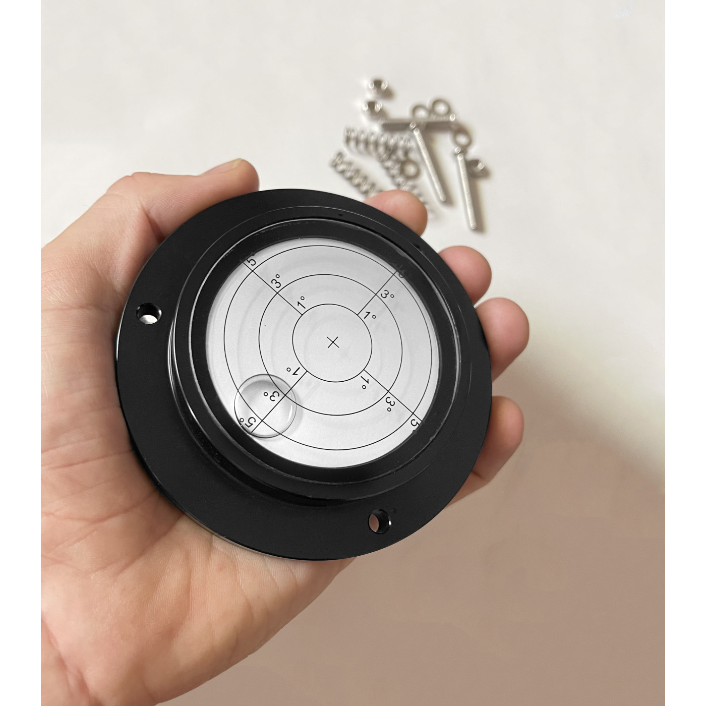 Tato kulatá vodováha má černý hliníkový plášť a bílý vnitřek.