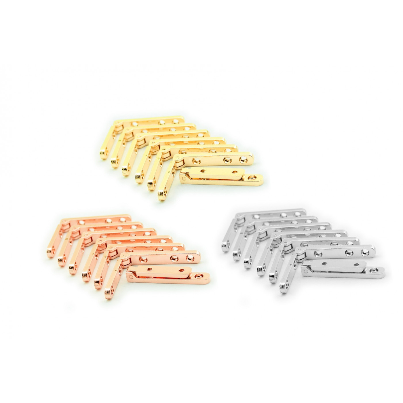 8 styks metal guldfarvede hængsler til æsker og lignende. Disse hængsler kan lave en maksimal vinkel på 90 grader, dette er nyttigt til kasser, så de nemt forbliver åbne. mål: se billede farve: guld antal stykker i dette sæt: 8