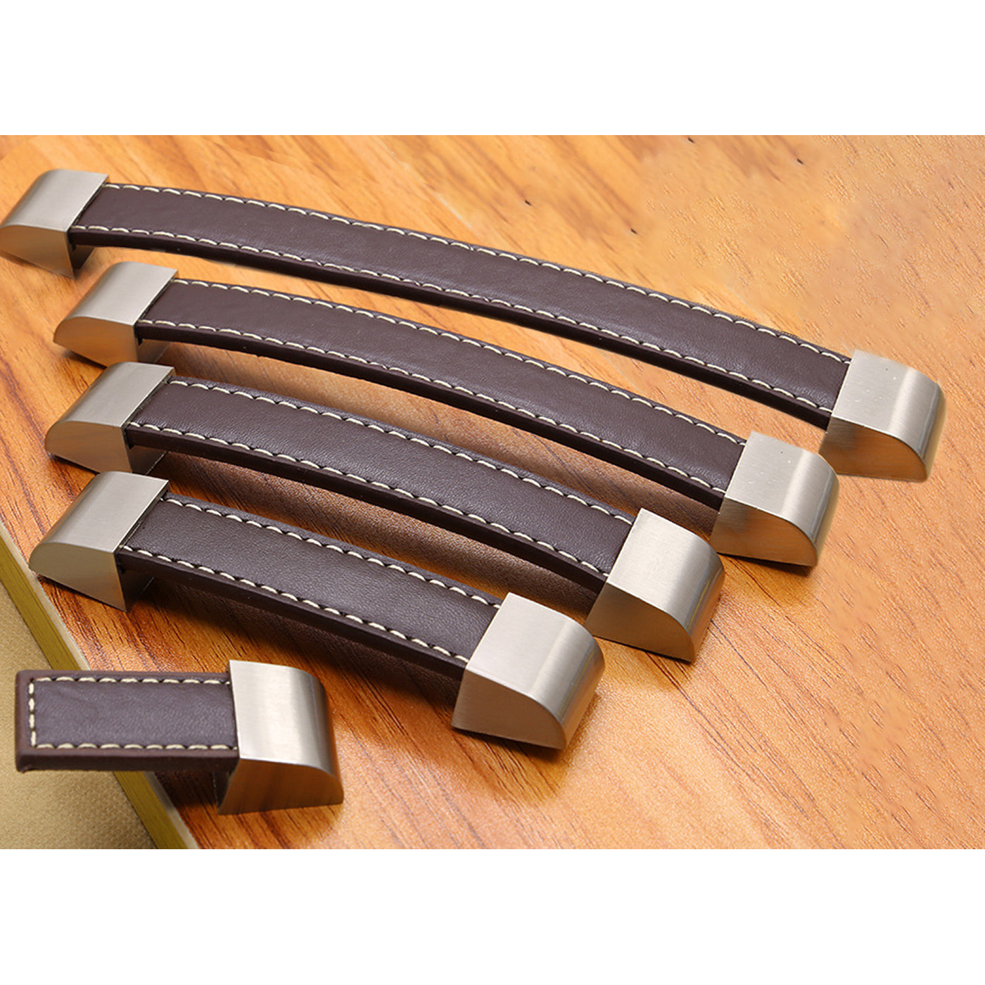 Asa de piel con dos agujeros roscados en la parte trasera. Con los pernos suministrados (M4), la manija se puede fijar de forma segura a su gabinete para una nueva apariencia.