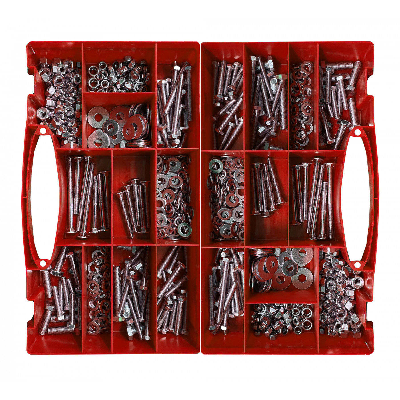 Este set consta de 900 piezas de diferentes tornillos, tuercas y arandelas galvanizados, aptos para todos. Se suministra en dos prácticas cajas de PVC con compartimentos. Tenga en cuenta que los colores de la caja pueden variar de la foto.
