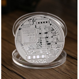 Pièce Bitcoin, couleur argent, dans une boîte en plastique. Cette pièce métallique est une variante physique du bitcoin numérique. Bien sûr, vous ne pouvez pas payer avec cela, et la pièce ne représente aucune valeur, mais c'est un joli cadeau pour vous ou pour une autre personne.