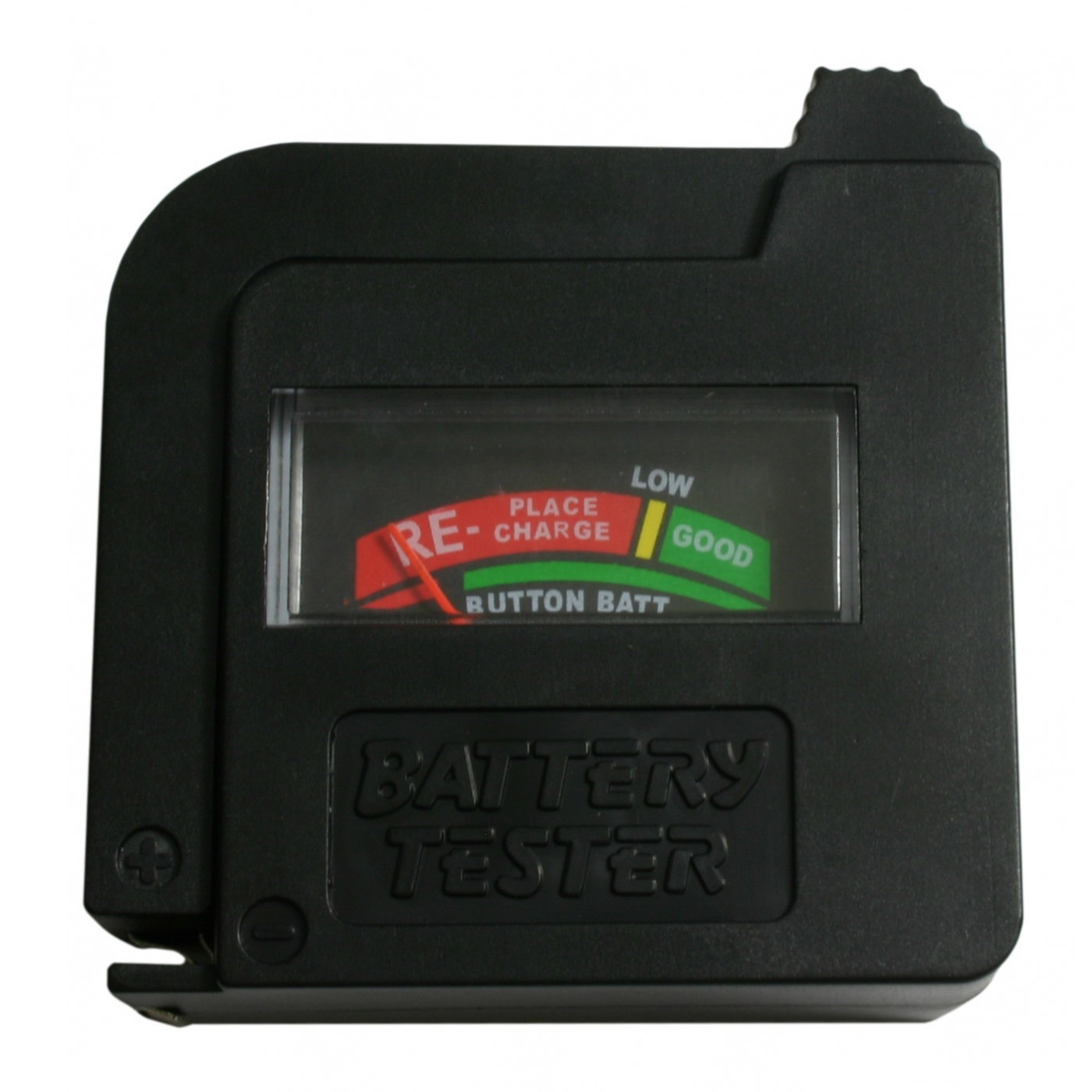 Testeur de piles pour différents types de piles: par exemple piles AAA, AA (penlite), C (bébé) et D (mono) et 9V. Positionnez la batterie entre les bras de contact à ressort. Assurez-vous que les bornes positive (+) et négative (-) de la batterie sont correctement positionnées sur les contacts. Observez l'état de la batterie sur l'échelle du testeur. Lors du test de batteries rectangulaires de 9 volts, touchez les bornes de la batterie avec les points de contact 9V situés sur le côté du testeur.