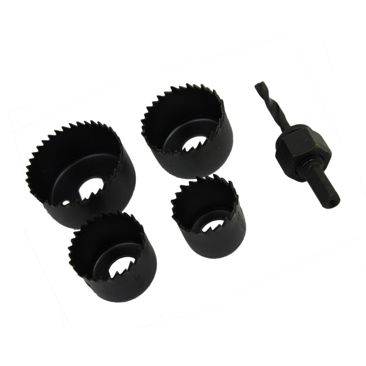 Set di seghe a tazza costituito da un mandrino e 4 seghe circolari con diametro 32 mm, 38 mm, 44 mm, 54 mm, in acciaio al carbonio. Questo set può essere utilizzato in un trapano manuale o fisso.