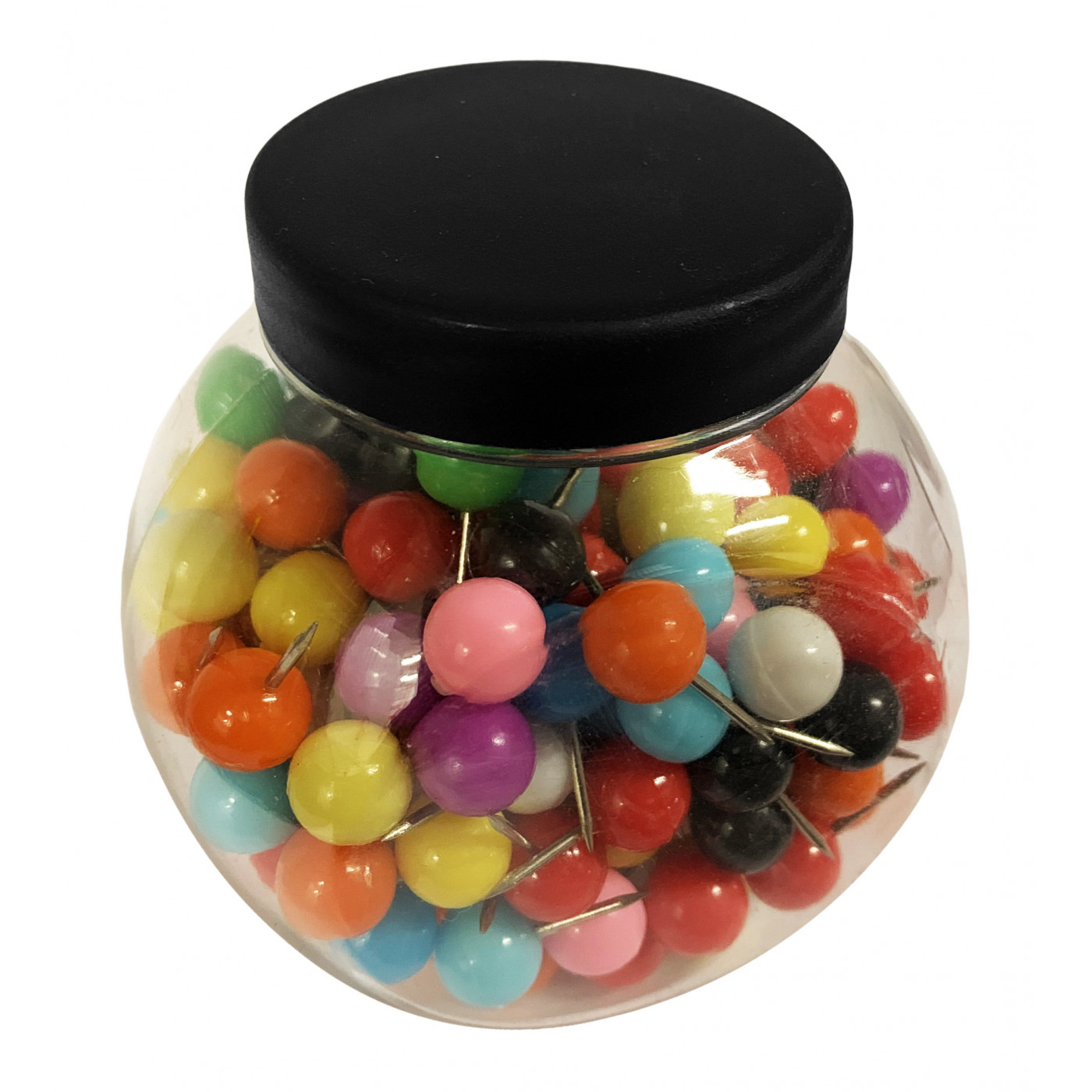 Punaises met een bolle kop, mixkleuren, geleverd in een transparant plastic doosje met schroefdop.