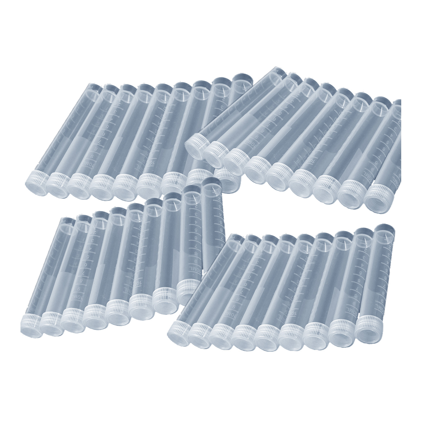 Set van 200 kunststof, transparante reageerbuizen met een inhoud van 10 ml, inclusief schroefdop.