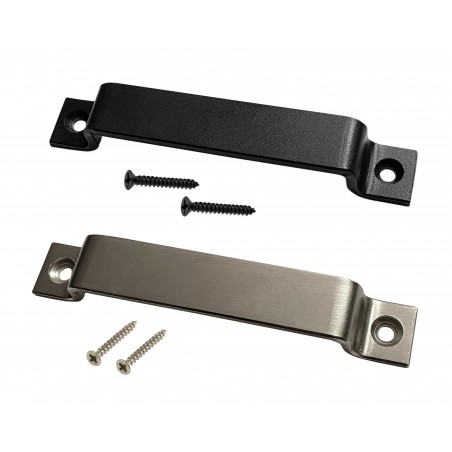Srebrny metalowy uchwyt z 2 otworami na śruby w odległości 140 mm od siebie. Uchwyt można przymocować do szafek, drzwi, szuflad lub np. ogrodzenia.