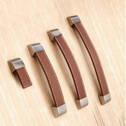 Skórzana rączka z dwoma gwintowanymi otworami z tyłu. Za pomocą dostarczonych śrub (M4) uchwyt można bezpiecznie przymocować do szafki, aby uzyskać nowy wygląd.