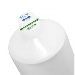 Garrafa semi-transparente de plástico com tampa roscável, recarregável.