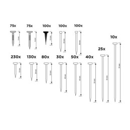 O conjunto inclui pregos com designs planos e sem cabeça, proporcionando flexibilidade para diferentes necessidades de fixação. O sortimento é alojado em uma caixa de plástico transparente e durável com compartimentos individuais, garantindo armazenamento organizado e acesso rápido ao tamanho certo quando necessário. Projetados para durabilidade e resistência, esses pregos são perfeitos para tarefas que vão desde simples reparos domésticos até projetos maiores de marcenaria.